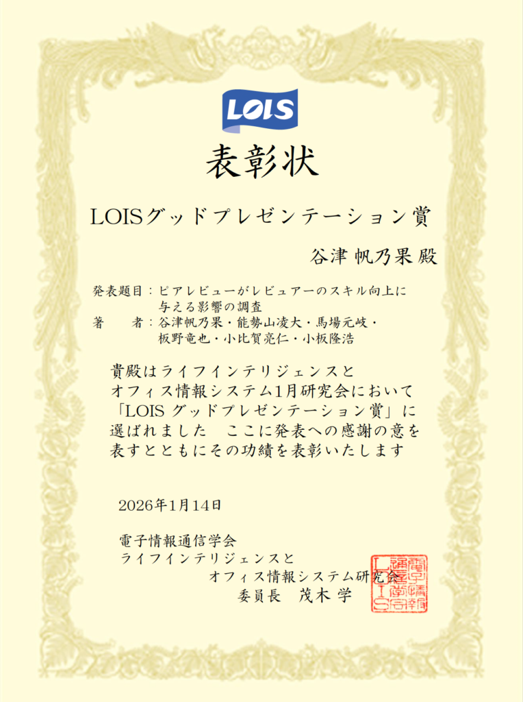 電子情報通信学会ライフインテリジェンスとオフィス情報システム(LOIS)研究会(2026年1月@佐賀大学で開催)において、M2 谷津さんのクラウドソーシングに関する研究発表「ピアレビューがレビュアーのスキル向上に与える影響の調査」というレビューアーの評価とスキル向上に関して発表を行い、数多くの発表者の中から「プレゼンテーション技術および発表内容が優れている」として評価され、グッドプレゼンテーション賞を受賞しました。AI技術のみに着目した研究が多い中、人間の力(クラウドソーシング)を適切に協調利用するという観点に独自性があり、またAI以上の処理能力を実現できる可能性を示しました。