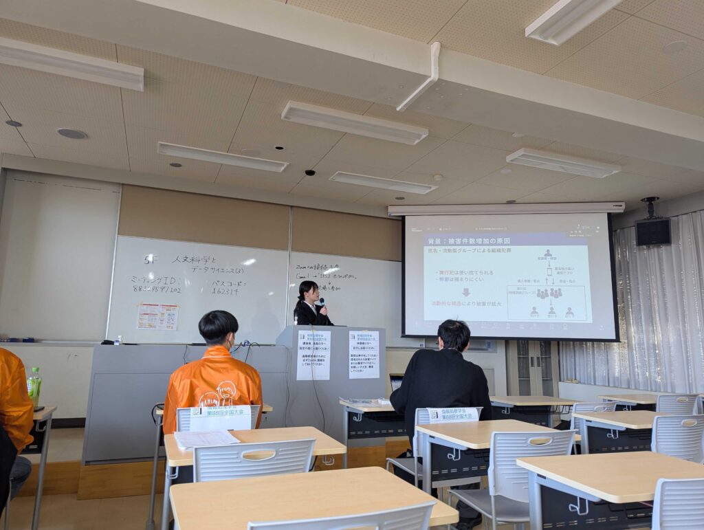 私は今回、「特殊詐欺検知に向けたアクティブ・プロービング型クラウドソーシングの活用方法に関する予備検討」をテーマに発表を行いました。本研究は、近年の生成AIの発展に伴い、特殊詐欺の巧妙化が進むことが予想される中で、クラウドソーシングを活用したアクティブ・プロービング手法による新たな検知アプローチを提案し、そのシステムについて検討を行いました。発表中には、接続不良が発生し焦りましたが、司会の方に助けてもらい、そこで数秒程度時間ができたので緊張が薄れました。