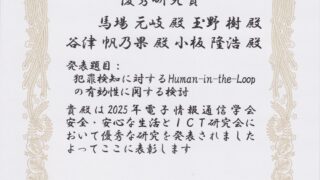 こんにちは、M1の馬場です。このたび、電子情報通信学会 安全・安心な生活とICT研究会(ICTSSL)において、2025年5月に発表した論文「犯罪検知に対するHuman-in-the-Loopの有効性に関する検討」が優秀研究賞に選出されまし...