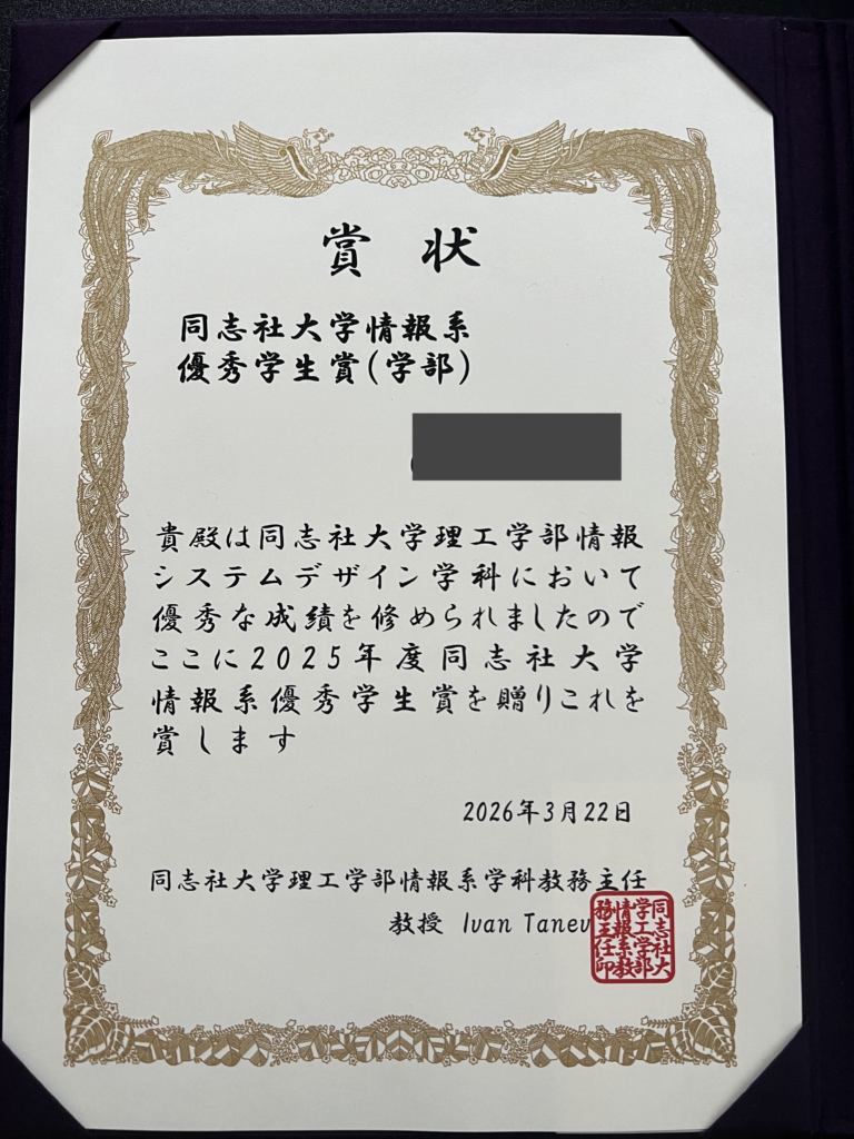同志社大学情報系優秀学生賞を受賞しました。この4年間、目の前にある学業や部活にひたすら取り組んでいたら、気付くとこのような名誉ある賞をいただけることになっていました。4年間頑張ってよかったです。特に最後の1年は大学での学びの集大成として、研究や学会を通して貴重な経験を得ることができました。教授の方々、先輩方、研究室の同期たち、本当にありがとうございました。自分は大学院に進学はせず、この春で卒業して就職します。学生生活が終わることは不安もあるし、仲良くなれた研究室の仲間と離れるのも寂しいですが、優秀学生として勝ち逃げさせてもらいます。この大学での学びを社会人になっても活かせるように精進します。
