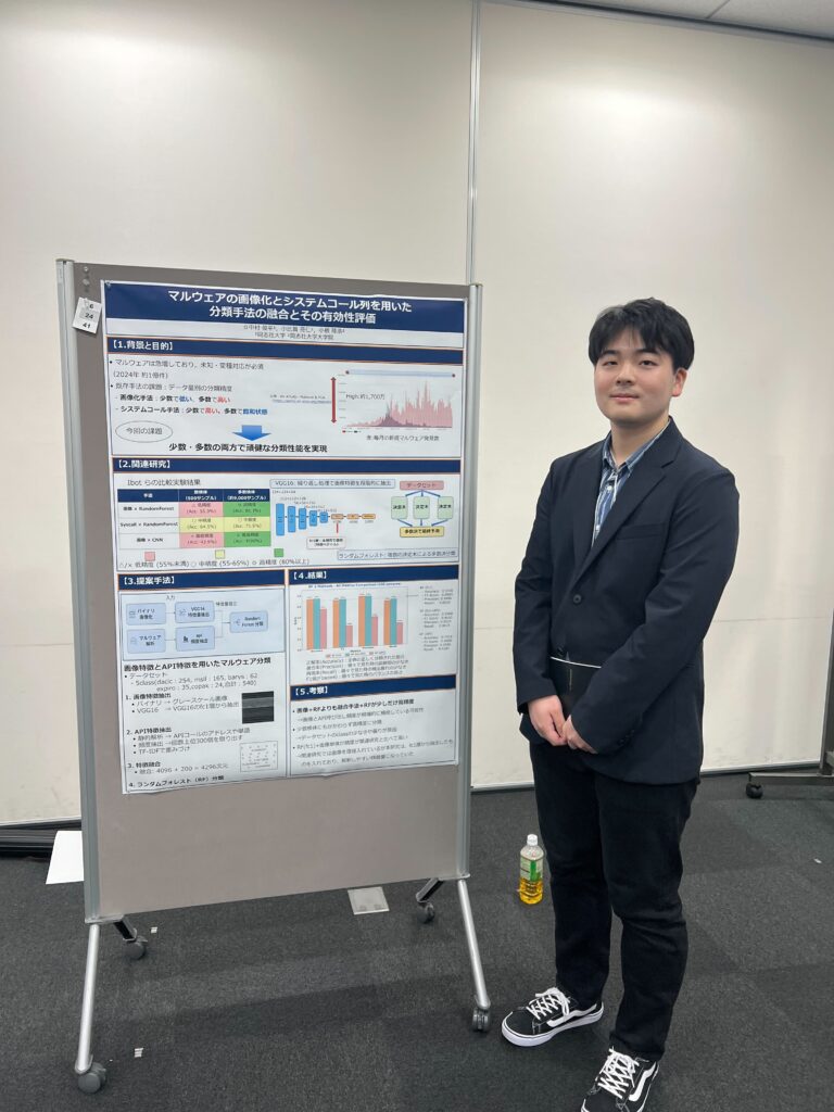 私は、「マルウェアの画像化とシステムコール列を用いた分類手法の融合とその有効性評価」を発表しました。本研究は、既存手法を融合して、欠点をなくし、より高い分類精度を目指します。質疑応答では、基礎的ながらも本質的な質問を多くいただきました。セキュリティ分野に詳しくない方からの質問が中心でしたが、手法や評価方法の妥当性や実用性について深く考える良い機会となりました。
