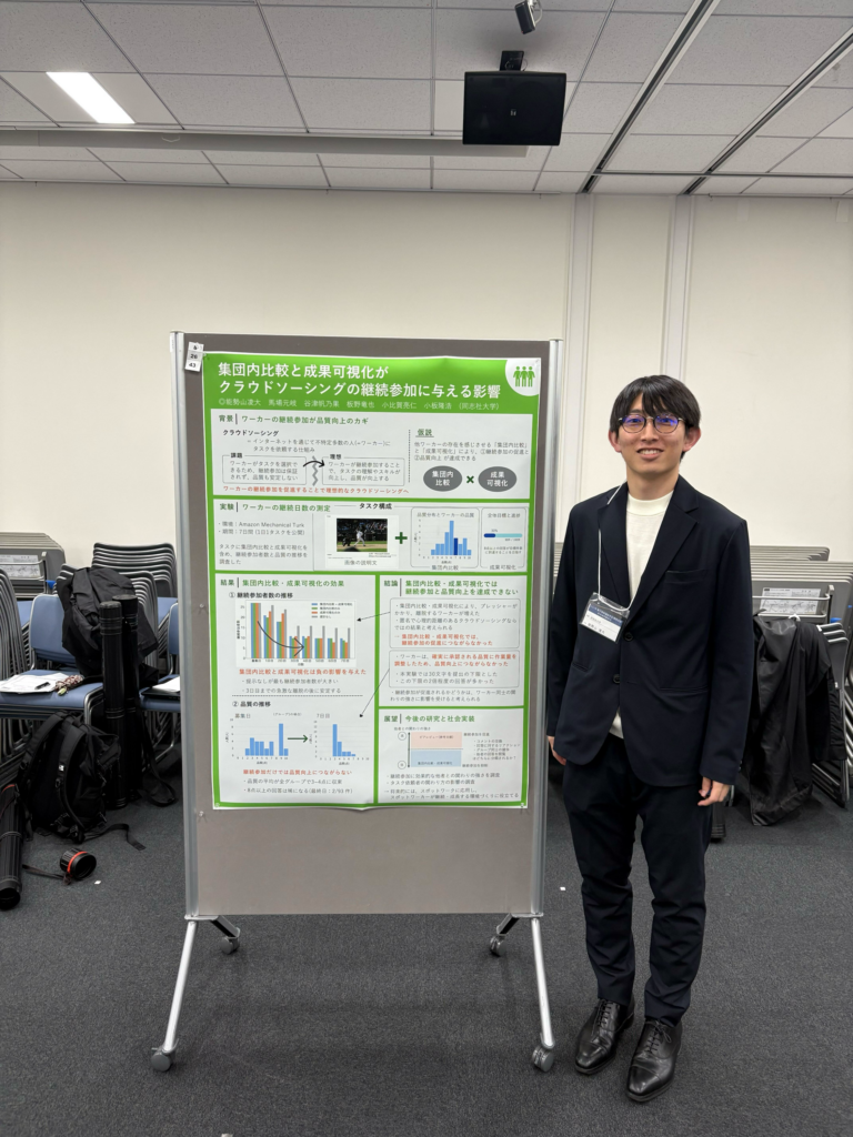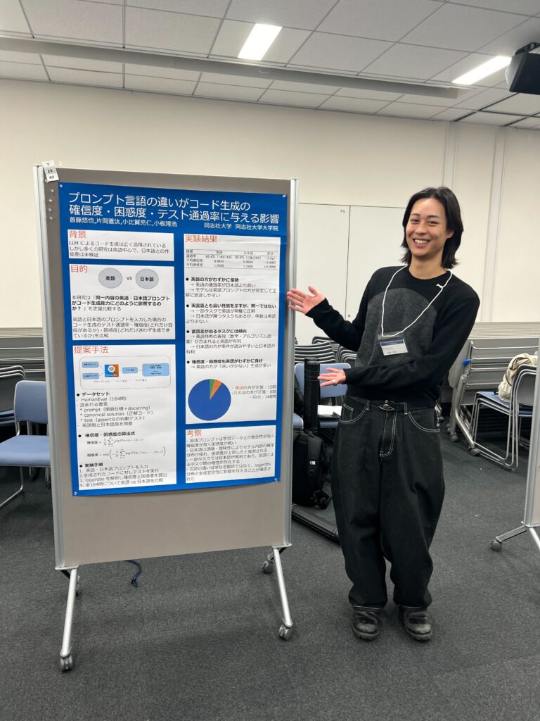 今回は同じ研究室B4の首藤君と能勢山君も一緒に参加しました。首藤君は「プロンプト言語の違いがコード生成の確信度・困惑度・テスト通過率に与える影響」、能勢山君は「集団内比較と成果可視化がクラウドソーシングの継続参加に与える影響」というテーマで発表しました。